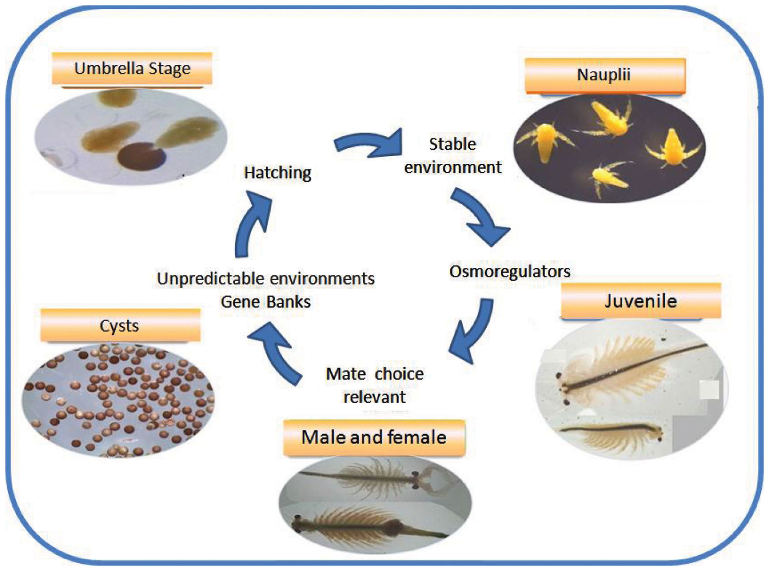 The life cycle of a salty survivor: the extremophile Artemia. Different stages of the cycle are actively involved in survival and reproduction under critical environmental conditions.