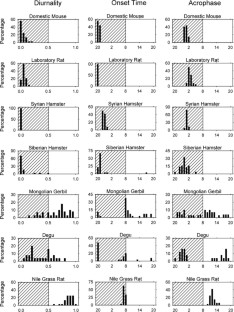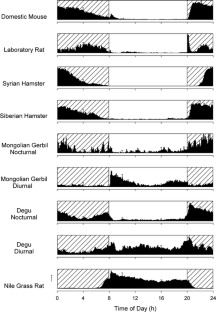 The locomotor activity rhythms of domestic mice, laboratory rats, Syrian hamsters, Siberian hamsters, Mongolian gerbils, degus, and Nile grass rats were compared. Running-wheel activity was monitored under a light–dark cycle with 12 h of light and 12 h of darkness per day. Nile grass rats were found to be reliably diurnal, whereas laboratory rats, Siberian hamsters, domestic mice, and Syrian hamsters were reliably nocturnal. Both diurnal and nocturnal subgroups were observed in Mongolian gerbils and degus. A downward gradient of diurnality was observed from Mongolian gerbils classified as diurnal, degus classified as diurnal, gerbils classified as nocturnal, and degus classified as nocturnal. Nocturnal degus remained nocturnal when tested with an infrared motion detector without running wheels. Thus, although the diurnal–nocturnal dichotomy could be applied to some of the species, it was not appropriate for others. The dichotomy may reflect researchers’ needs for systematization more than a natural distinction between species. Through mechanisms as yet poorly understood, the balance between entraining and masking processes seems to generate a gradient of temporal niches that runs from predominantly diurnal species to predominantly nocturnal species with many chronotypes in between, including species that exhibit wide intra-species gradients of temporal niche.
